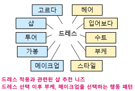 ‘드레스’는 드레스 착용과 관련된 샵 추천에 관한 요구가 많았고 드레스 선택 이후 부케, 메이크업을 선택하는 행동 패턴을 보였다.