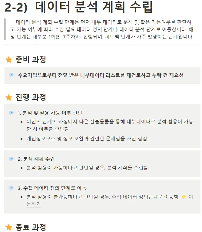 데이터 분석 계획 수립 단계는 먼저 내부 데이터로 분석 및 활용 가능여부를 판단하고 가능 여부에 따라 수집 필요 데이터 정의 단계나 데이터 분석 단계로 이동합니다. 해당 단계는 대부분 1회(4~5주차)에 진행되며, 피드백 단계가 자주 발생하는 단계입니다.