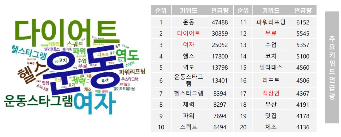 -운동, 헬스, 역도, 스쿼트, 파워리프팅, 필라테스, 체조, 리프트, 헬스 등 운동 관련된 검색어들이 높은 빈도를 차지