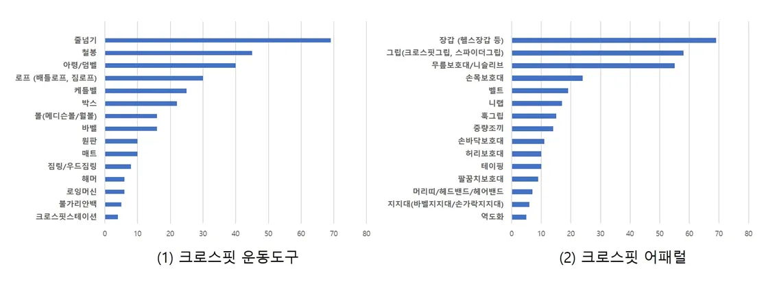 -네이버쇼핑에서 크로스핏을 검색어로 판매도 순으로 검색하여 크롤링하였다. 상위 500개 제품을 기준으로 판매도 높은 운동용품 및 어패럴을 분류하였다.