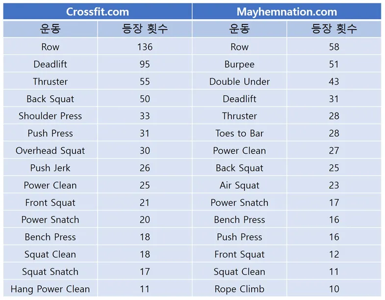 크로스핏 관련 홈페이지에 소개된 WoD에 사용된 운동 동작