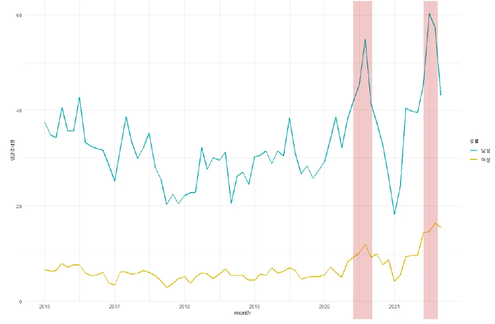 네이버 검색량을 성별, 연령대로 나누어 시각화 분석