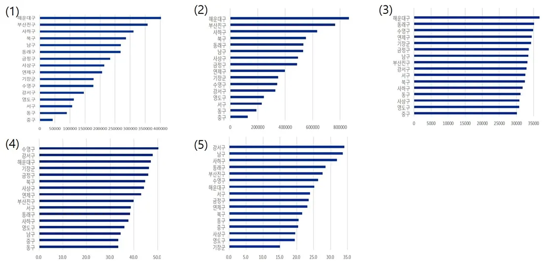 -각각의 고려 요소들을 1위부터 16위까지 랭킹을 내어 16점부터 1점까지 부여한 뒤, 각각을 합산하여 부산 내 입지 지수를 내었다. 해운대구, 부산진구, 동래구, 수영구, 사하구 순으로 입지 지수가 높게 나왔다