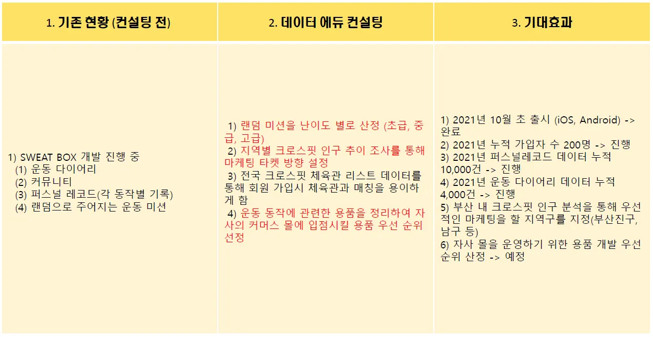 - 컨설팅에서 분석한 입지 정보를 기반으로, 새로운 크로스핏 센터를 부산 내에서 오픈하여 온·오프라인을 아우르는 회사로 성장할 것으로 기대한다.